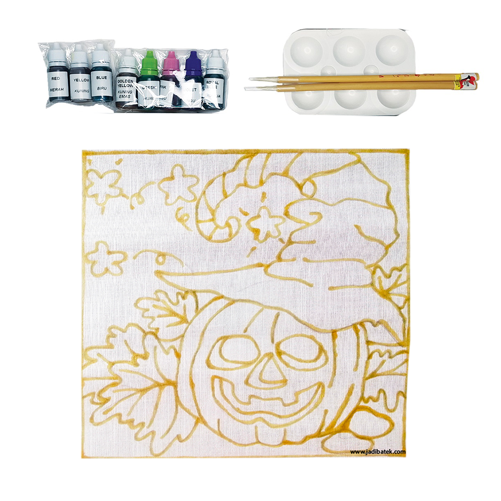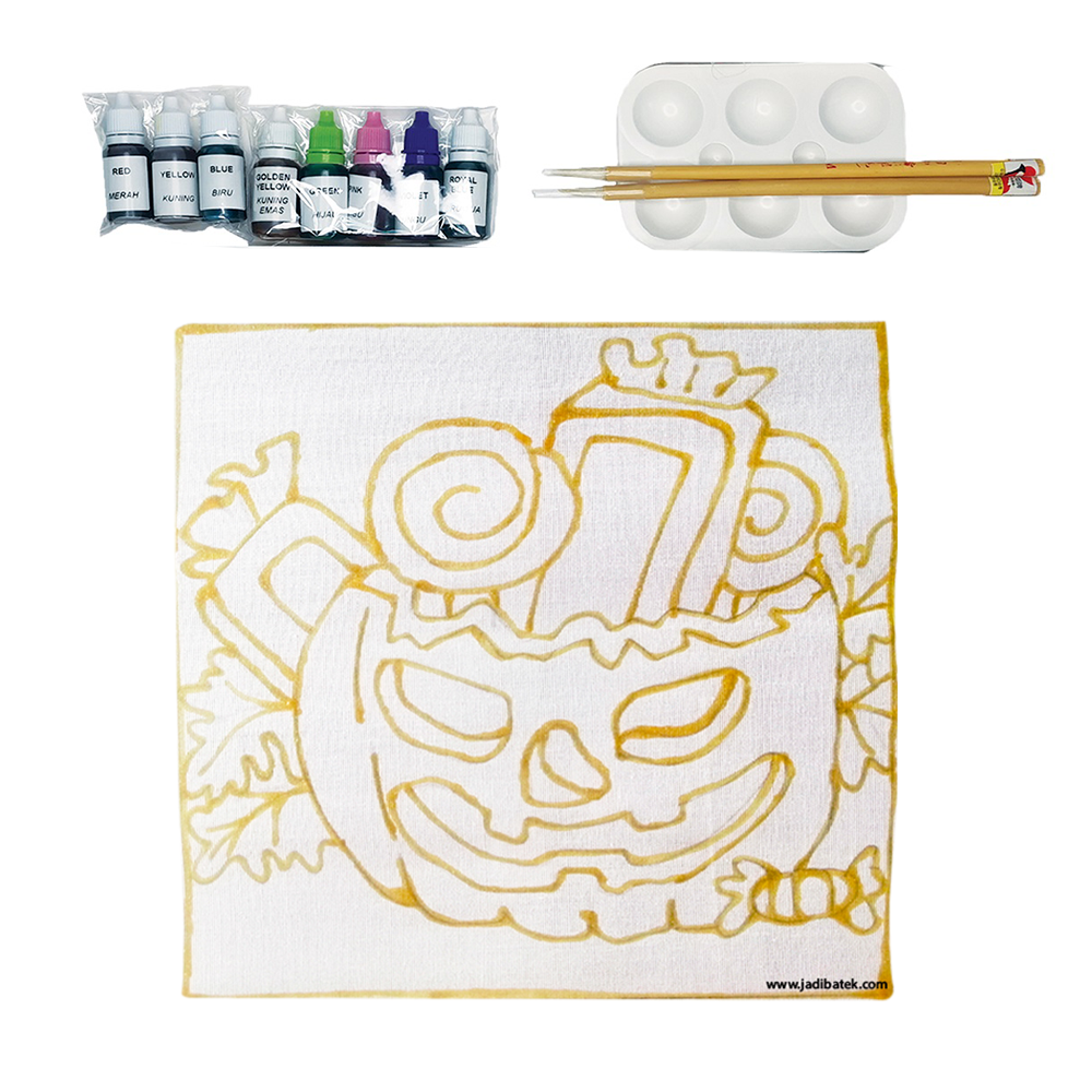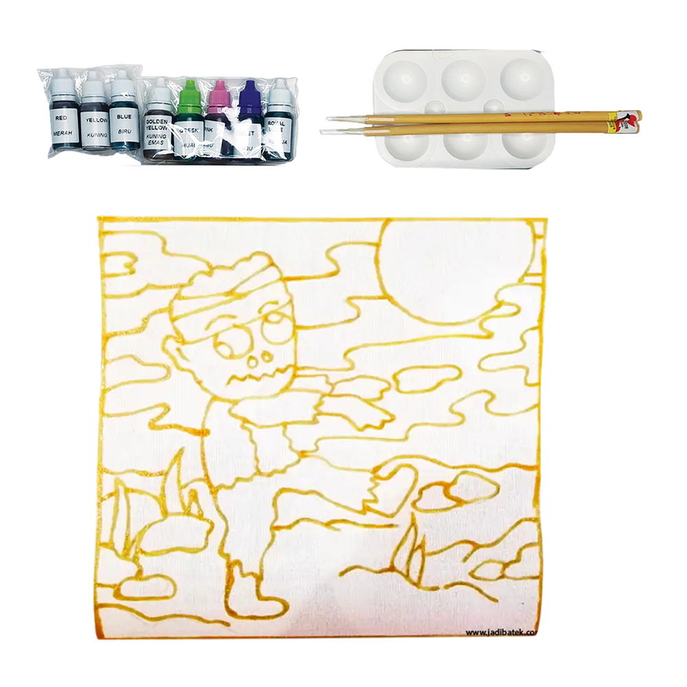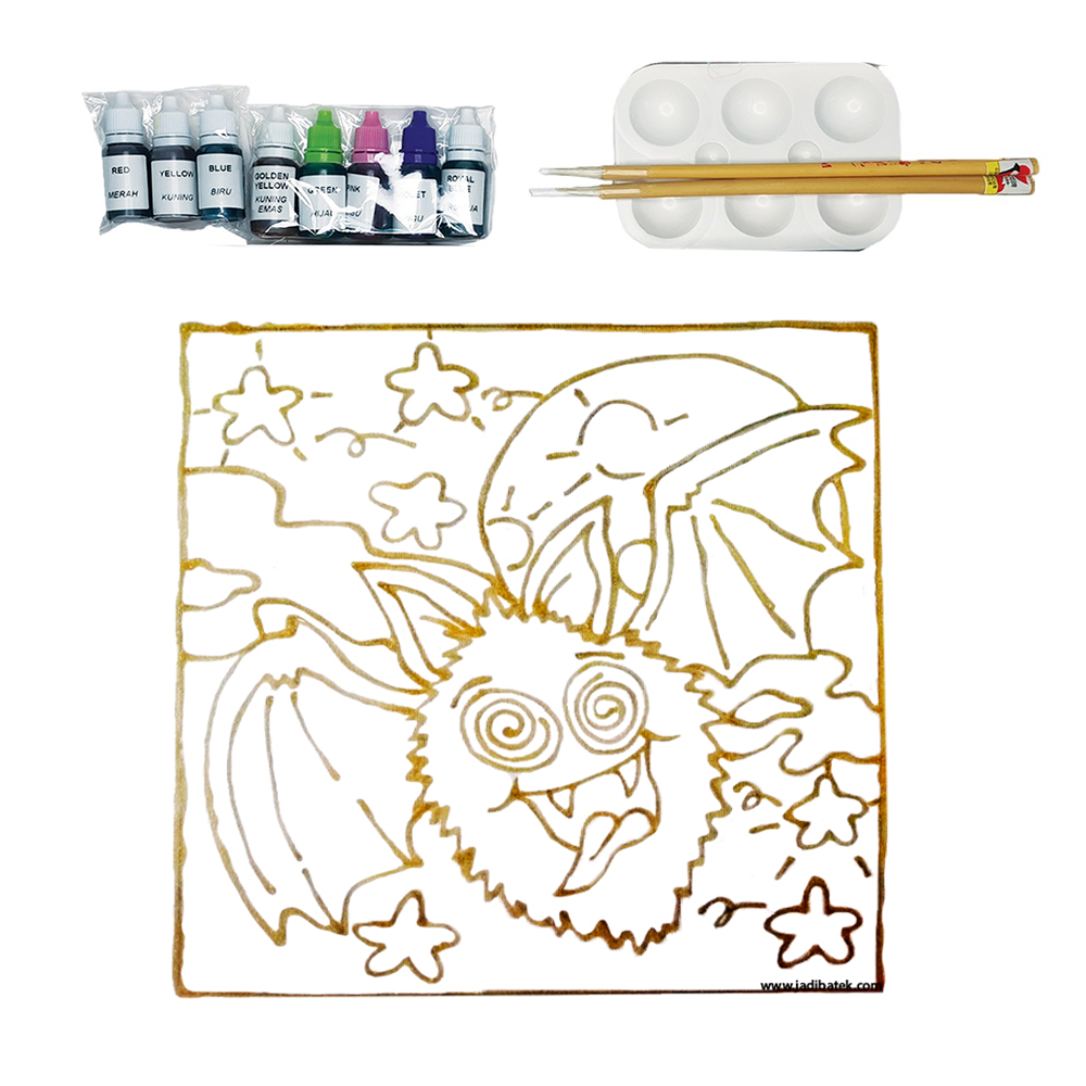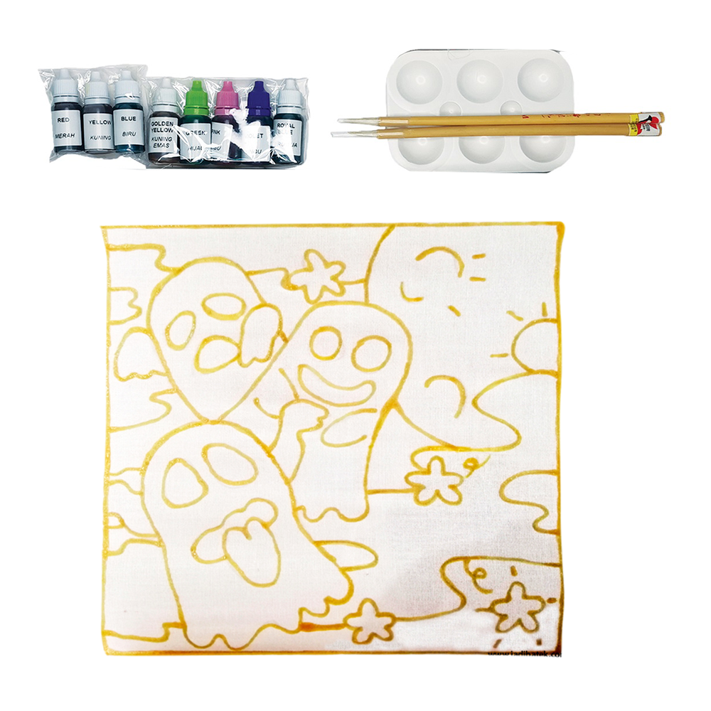 ✅ ดีไซน์ลายผ้าบาติกพร้อมกรอบกระดาษ ✅ สีบาติก 3 สี ✅ จานสี ✅ พู่กัน 1 อัน